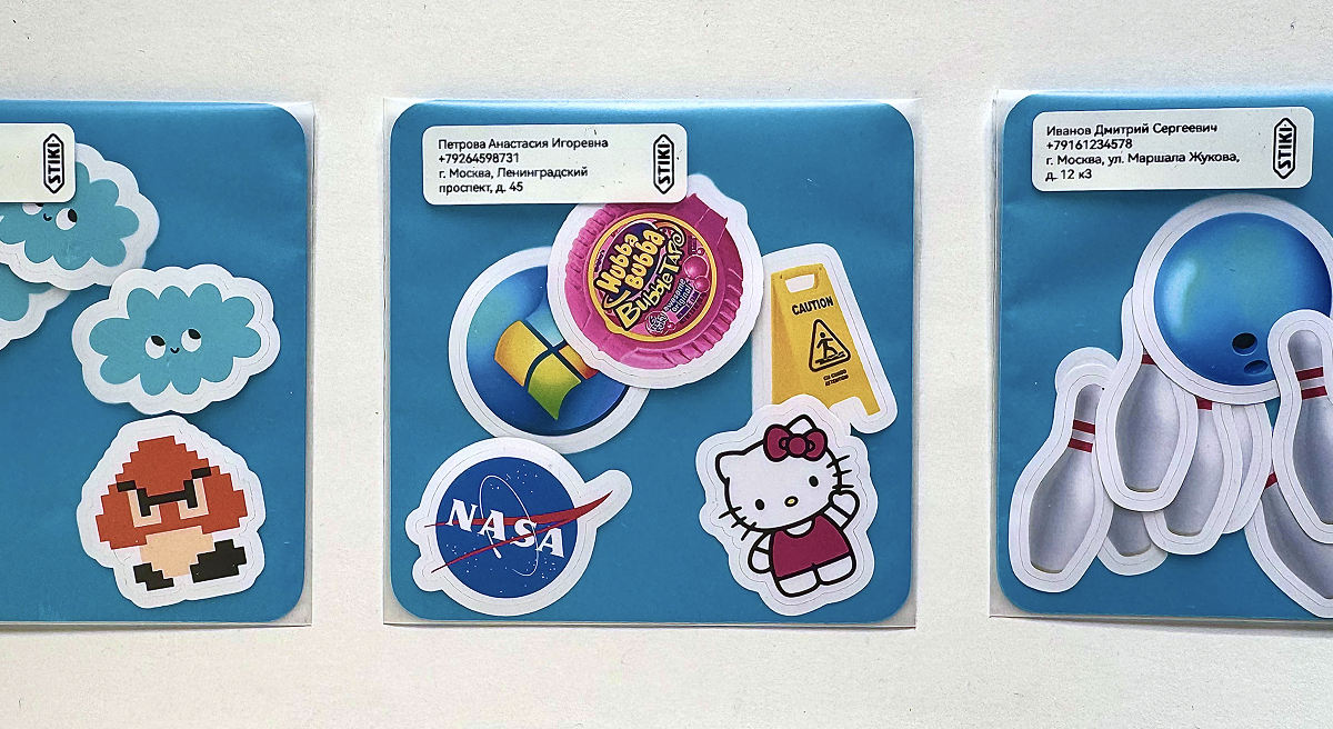 Все наши стикеры одного размера. Мы долго подбирали формат методом проб и ошибок. Маленькие теряются, а большие быстро забивают поверхность. В итоге мы нашли размер, который позволяет наклеить много стикеров и выразить себя в полной мере.